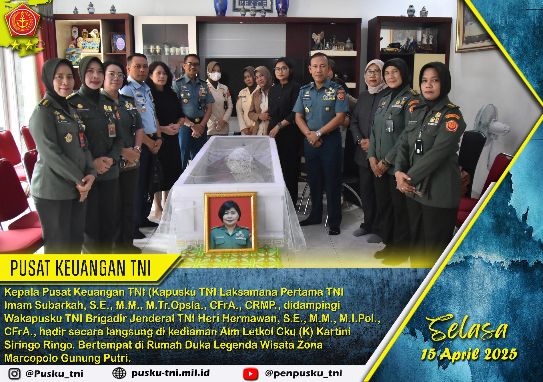 Kepala Pusat Keuangan TNI (Kapusku TNI Laksamana Pertama TNI Imam Subarkah, S.E., M.M., M.Tr.Opsla., CFrA., CRMP., didampingi Wakapusku TNI Brigadir Jenderal TNI Heri Hermawan, S.E., M.M., M.I.Pol., CFrA., hadir secara langsung di kediaman Alm Letkol Cku (K) Kartini Siringo Ringo. Bertempat di Rumah Duka Legenda Wisata Zona Marcopolo Gunung Putri. Selasa (15/04/2025)
