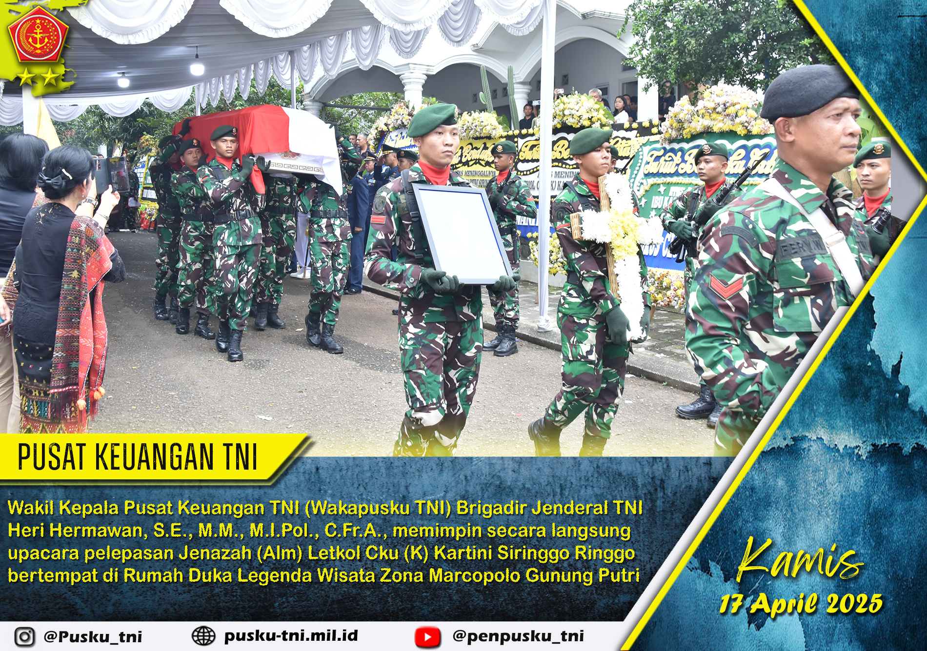 Wakil Kepala Pusat Keuangan TNI (Wakapusku TNI) Brigadir Jenderal TNI Heri Hermawan, S.E., M.M., M.I.Pol., C.Fr.A., Mewakili Kapusku TNI Laksamana Pertama TNI Imam Subarkah, S.E., M.M., M.Tr.Opsla., CFrA., CRMP., memimpin secara langsung upacara pelepasan Jenazah (Alm) Letkol Cku (K) Kartini Siringgo Ringgo bertempat di Rumah Duka Legenda Wisata Zona Marcopolo Gunung Putri. Kamis (17/04/2025)