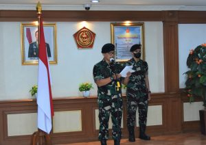 Kapusku TNI Marsekal Muda TNI Danang Hadiwibowo, S.E., M.M. memimpin kegiatan acara Serah Terima Jabatan Kabidlakgarbia Pusku TNI, Laporan Korps Kenaikan Pangkat periode 1 April 2022 serta Pelepasan personel Mutasi dan Purna Tugas di Lobby Lantai 3 Pusku TNI, Jum’at (1/4/2022).